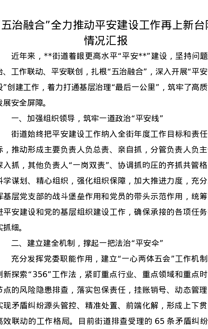 “五治融合”全力推动平安建设工作再上新台阶情况汇报