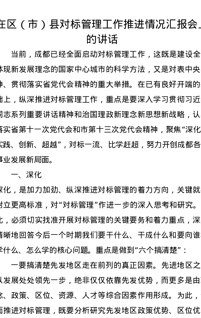 优选讲话:在区(市)县对标管理工作推进情况汇报会上的讲话