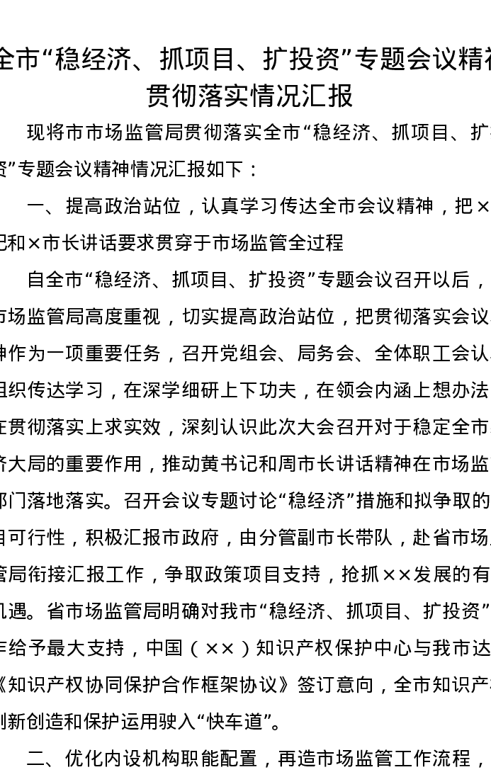 全市“稳经济、抓项目、扩投资”专题会议精神贯彻落实情况汇报