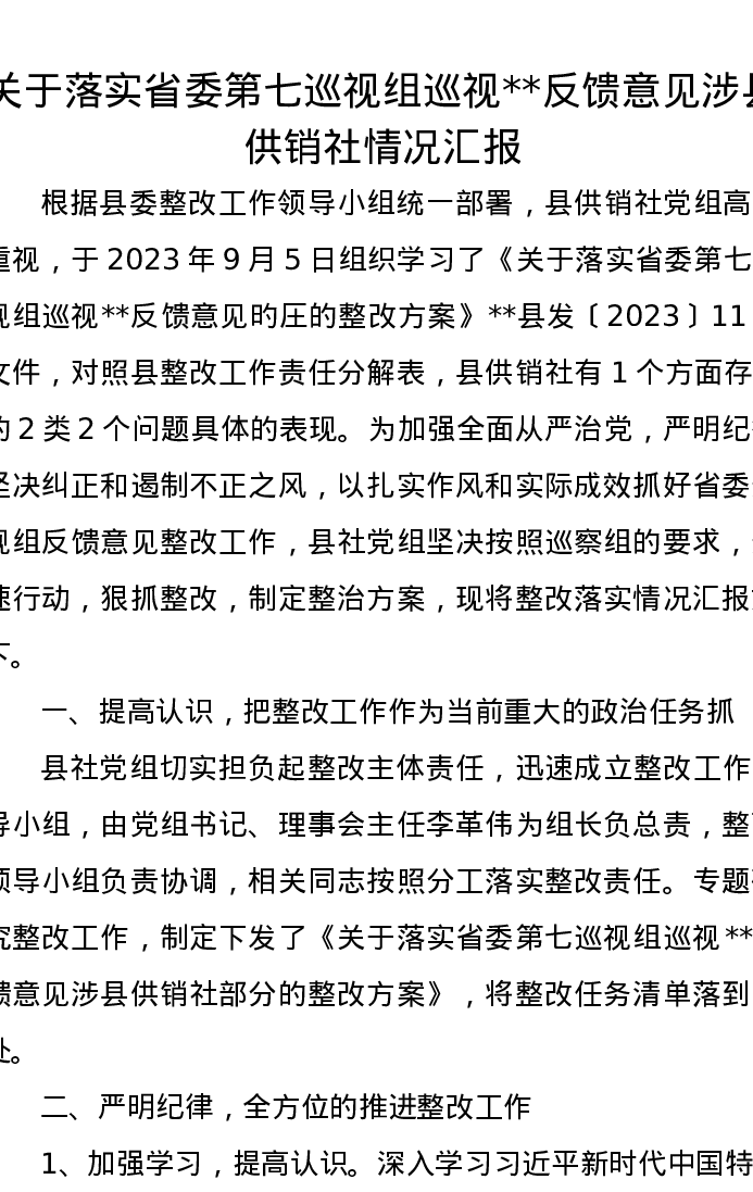 关于落实省委第七巡视组巡视反馈意见涉县供销社情况汇报