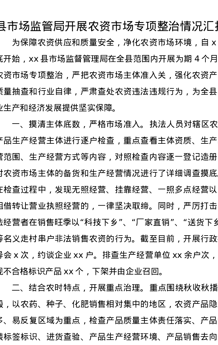 县市场监管局开展农资市场专项整治情况汇报