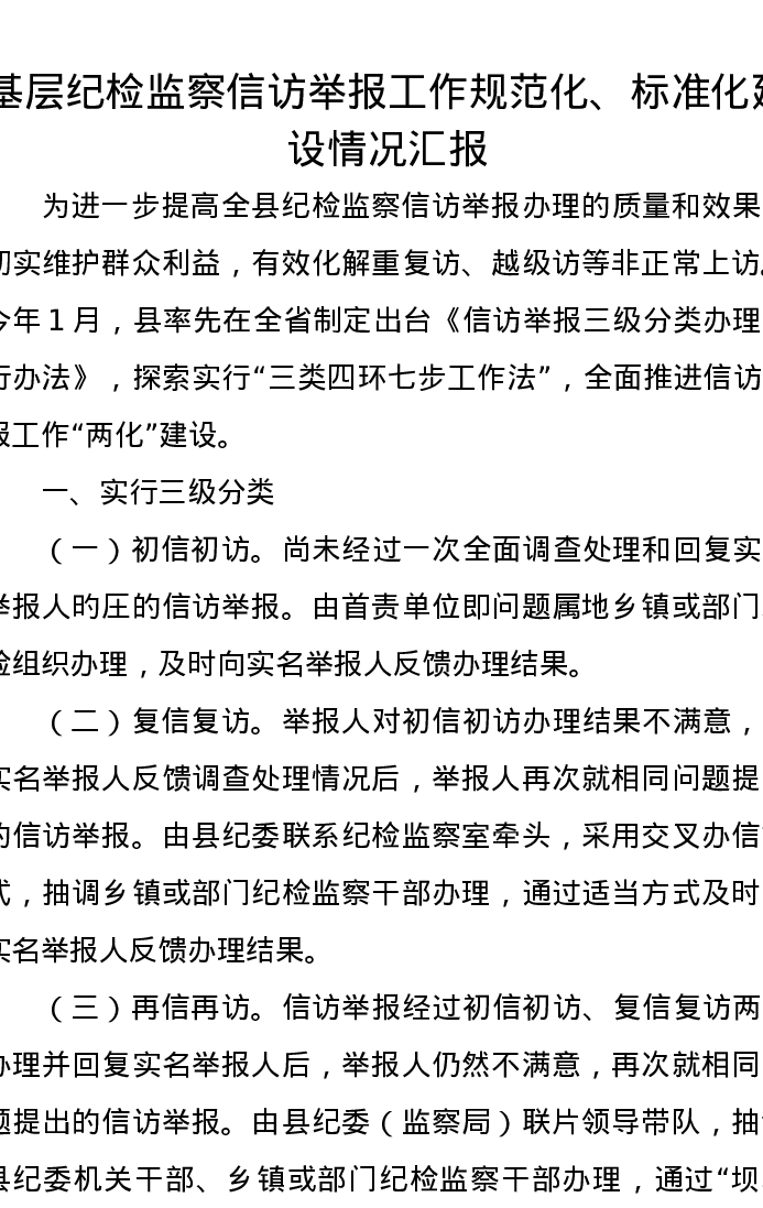 基层纪检监察信访举报工作规范化、标准化建设情况汇报