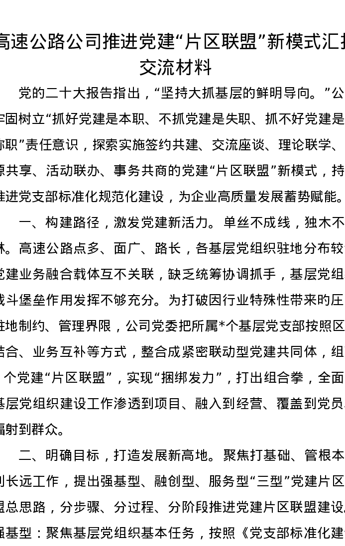 高速公路公司推进党建“片区联盟”新模式汇报交流发言材料