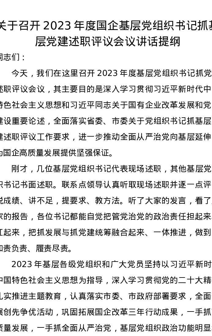 关于召开2023年度国企基层党组织书记抓基层党建述职评议会议讲话提纲
