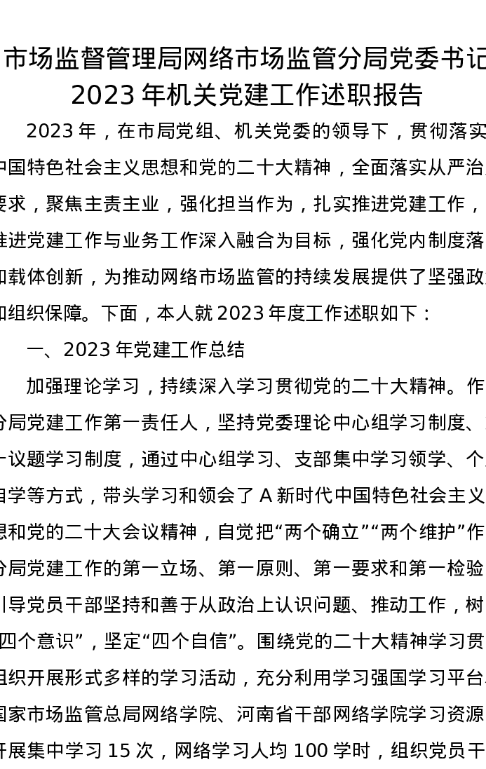 市场监督管理局网络市场监管分局党委书记2023年机关党建工作述职报告