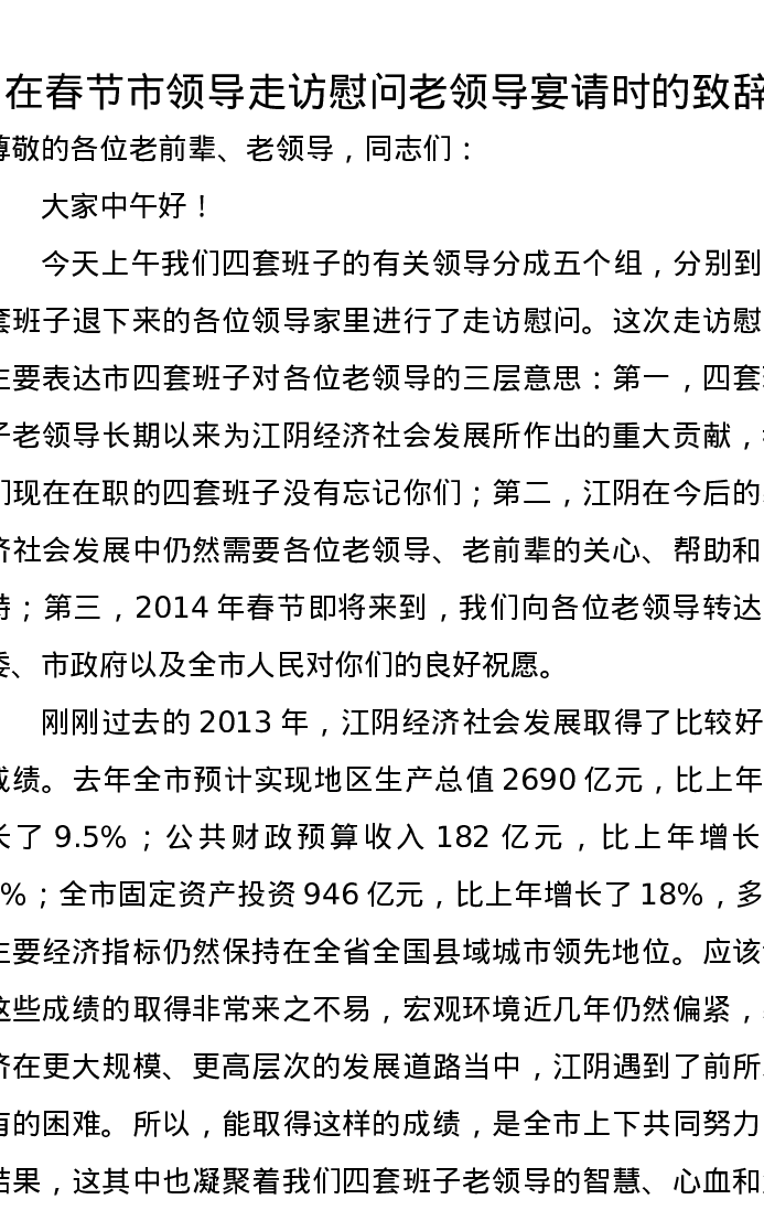 优选讲话:在春节市领导走访慰问老领导宴请时的致辞
