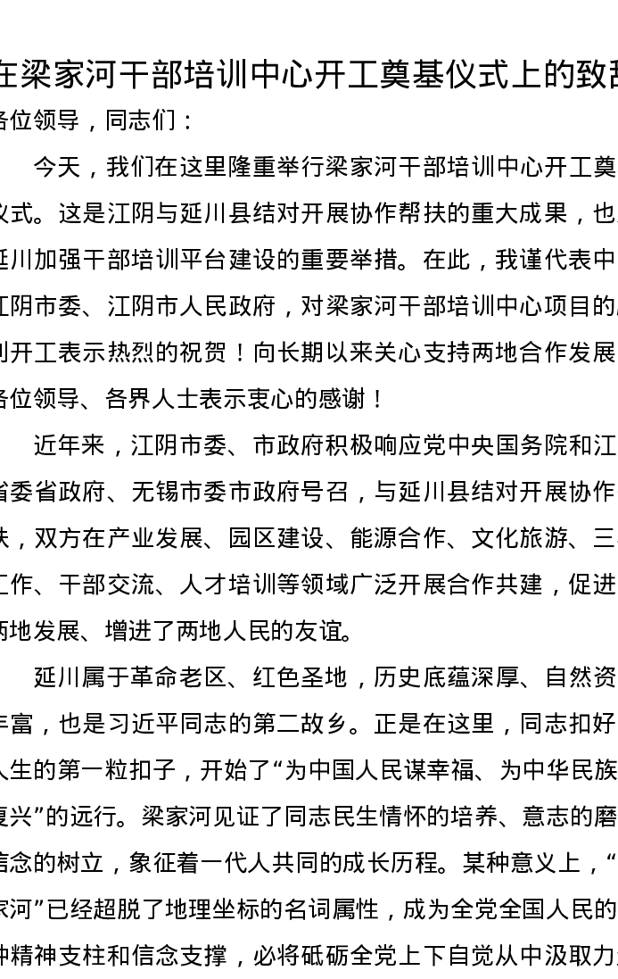 优选讲话:在梁家河干部培训中心开工奠基仪式上的致辞