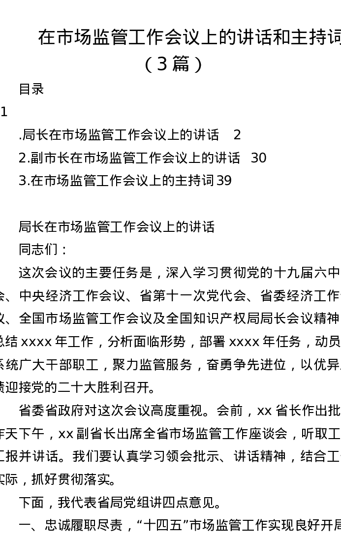 汇编:在市场监管工作会议上的讲话和主持词3篇