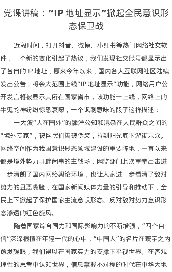 党课讲稿:“IP地址显示”掀起全民意识形态保卫战