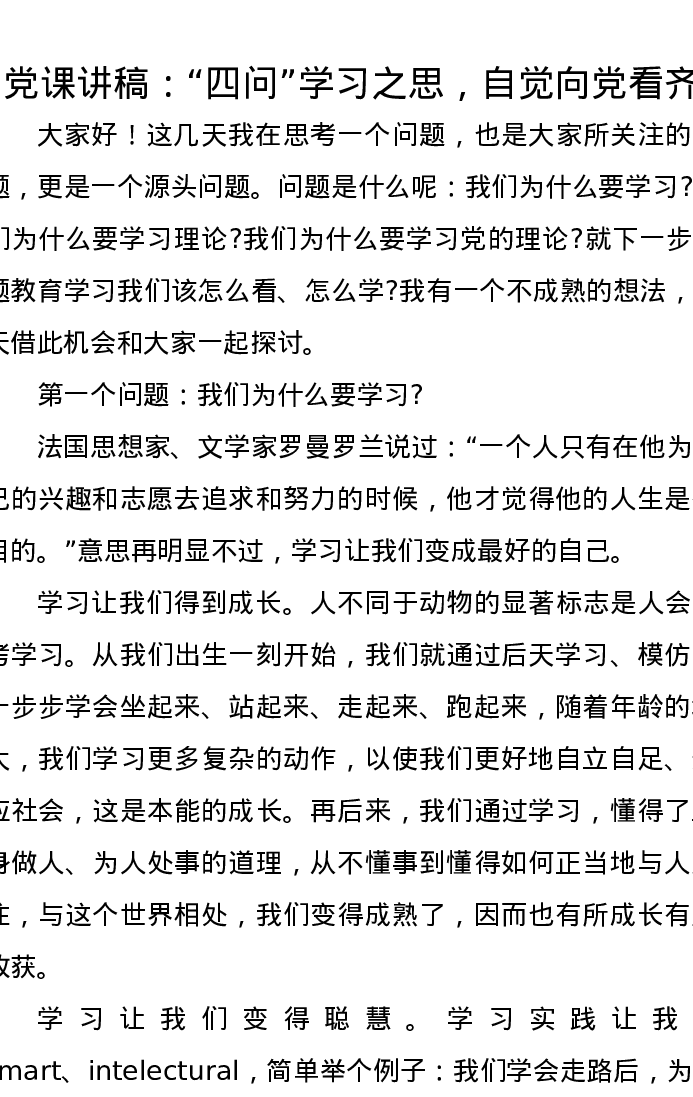 党课讲稿:“四问”学习之思,自觉向党看齐