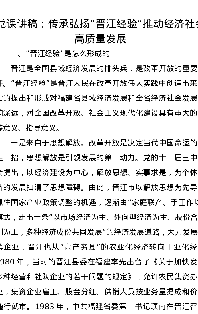 党课讲稿:传承弘扬“晋江经验”推动经济社会高质量发展