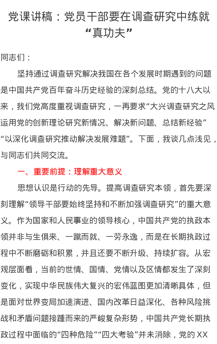 党课讲稿:党员干部要在调查研究中练就“真功夫”
