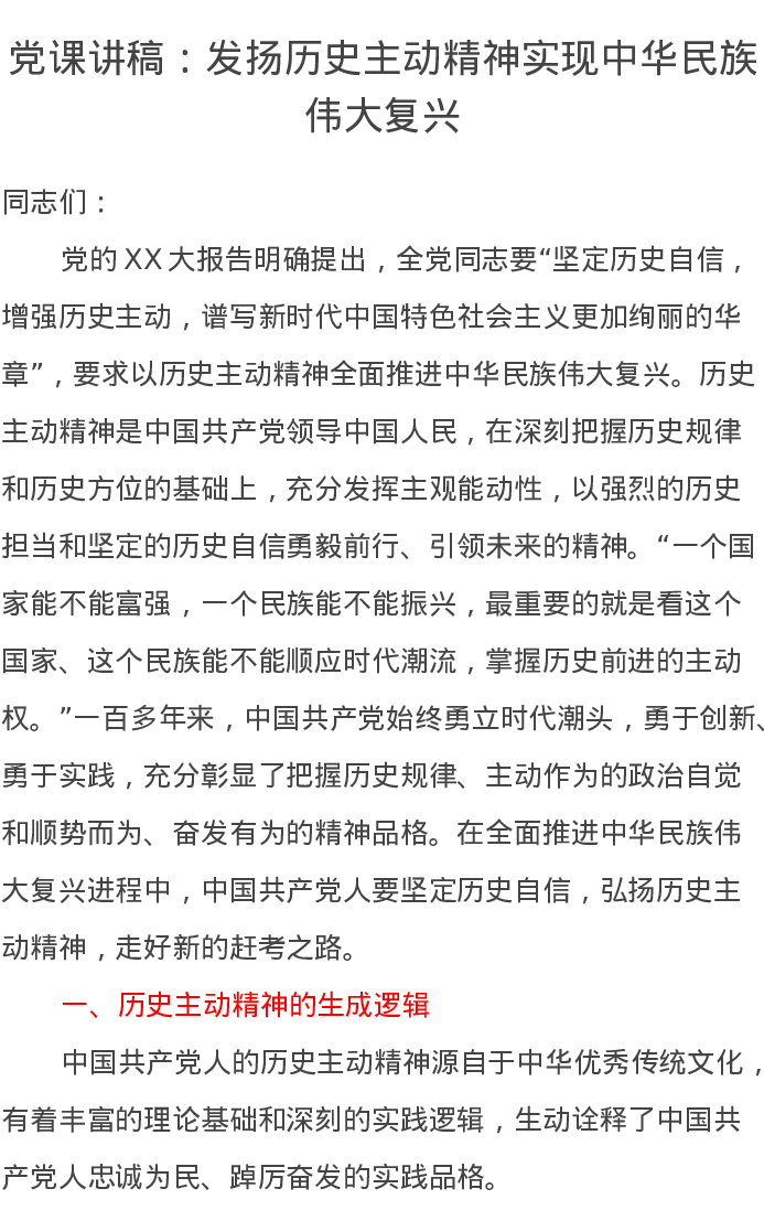 党课讲稿:发扬历史主动精神实现中华民族伟大复兴