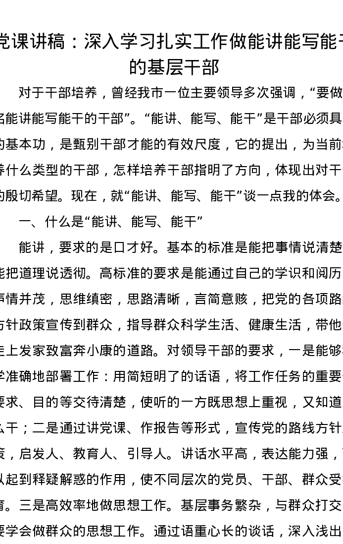 党课讲稿:深入学习扎实工作做能讲能写能干的基层干部