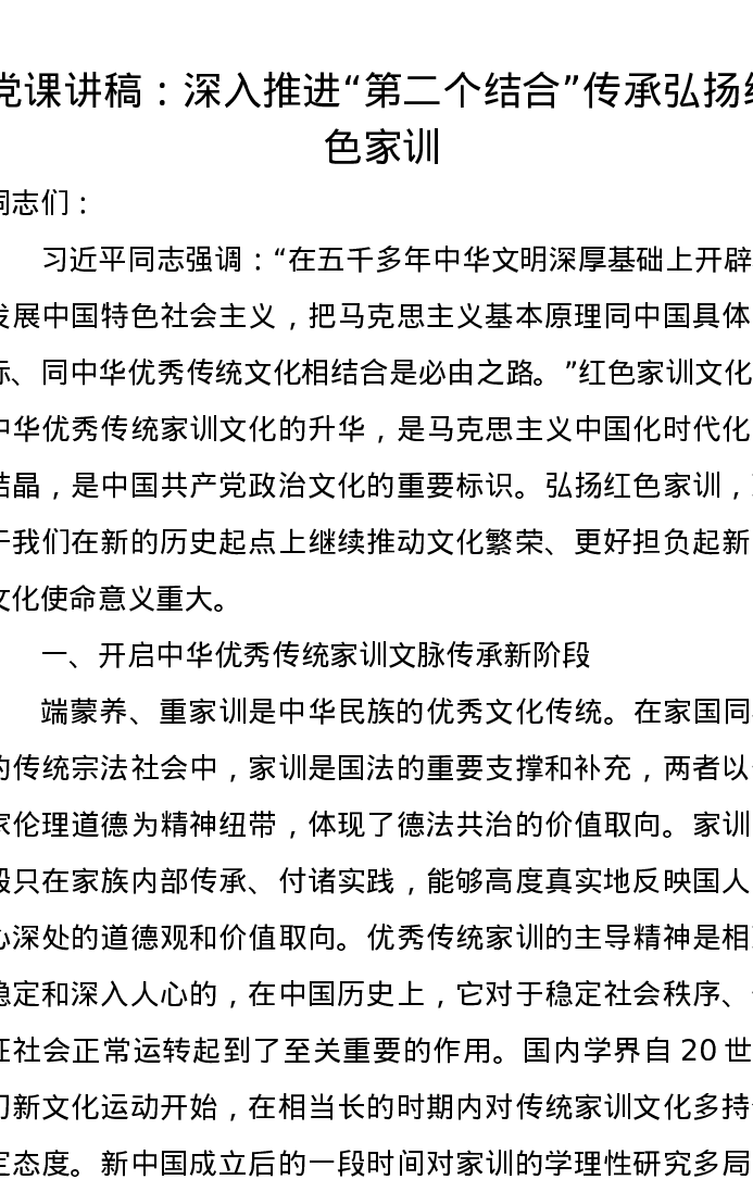 党课讲稿:深入推进“第二个结合”传承弘扬红色家训