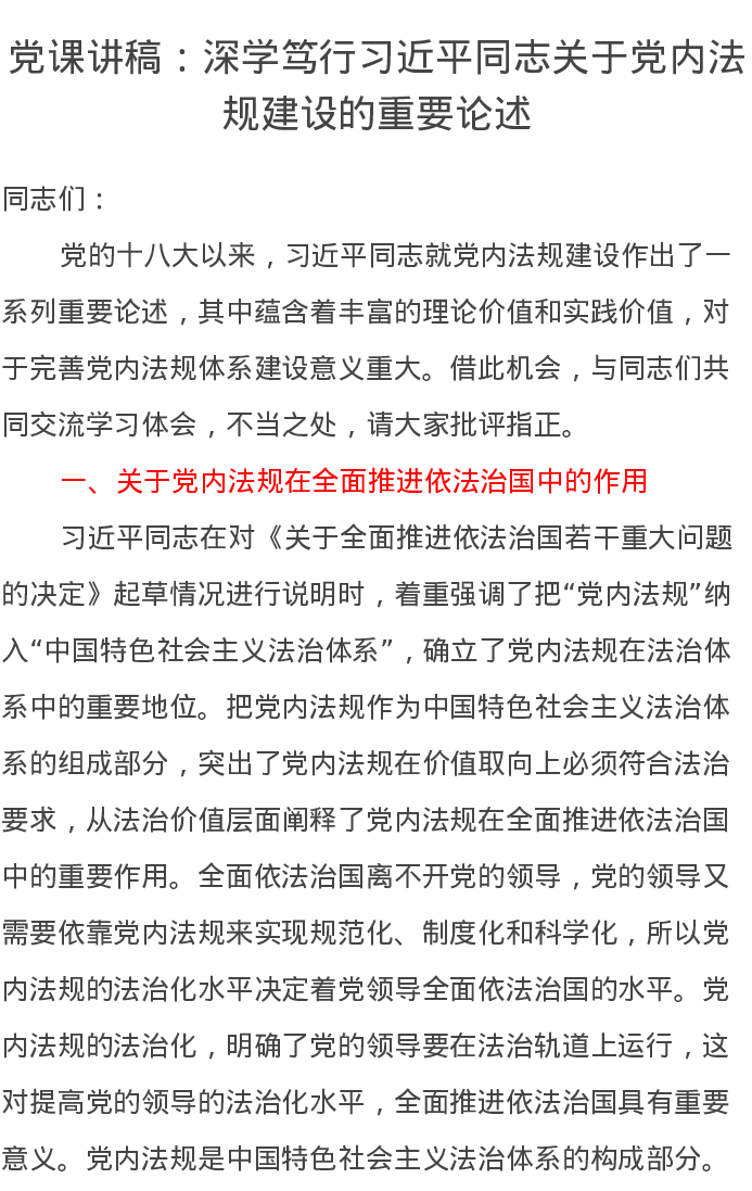 党课讲稿:深学笃行习近平总书记关于党内法规建设的重要论述