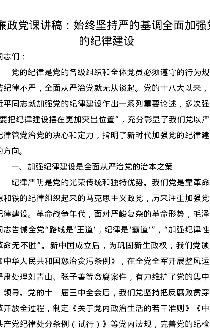 廉政党课讲稿:始终坚持严的基调全面加强党的纪律建设