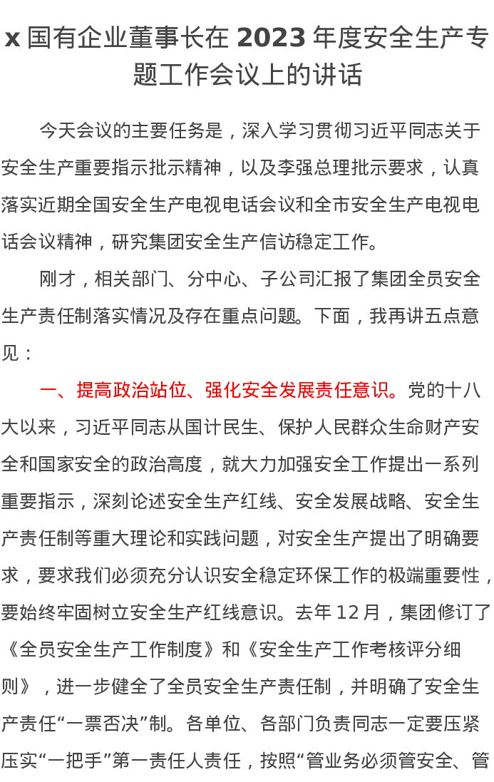 x国有企业董事长在2023年度安全生产专题工作会议上的讲话