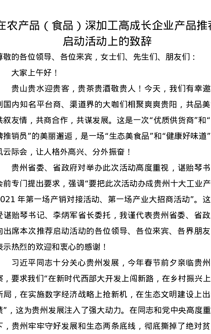 优选讲话:在农产品(食品)深加工高成长企业产品推荐启动活动上的致辞