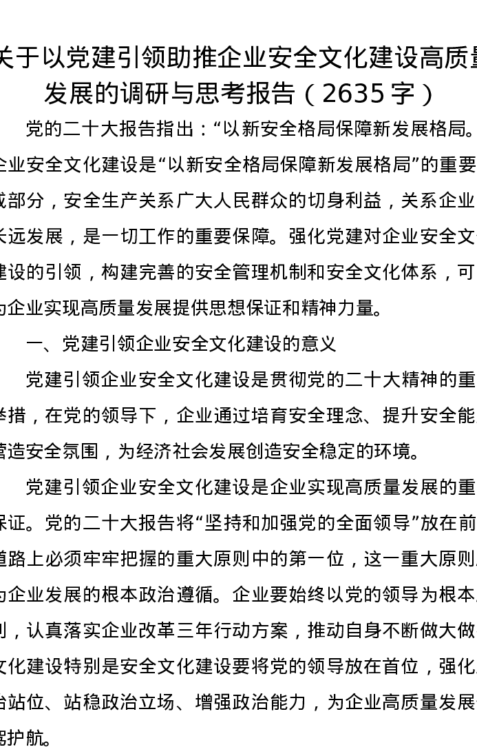 关于以党建引领助推企业安全文化建设高质量发展的调研与思考报告