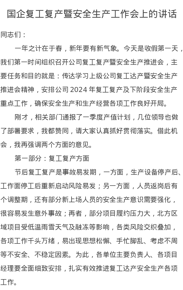 国企复工复产暨安全生产工作会上的讲话
