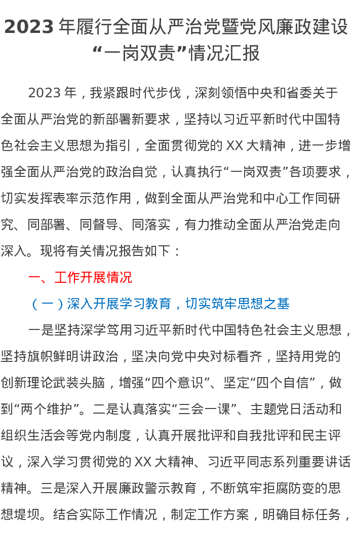 2023年履行全面从严治党暨党风廉政建设“一岗双责”情况汇报