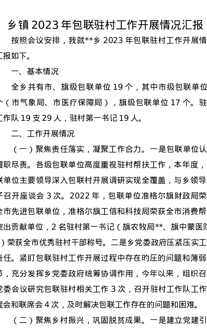 乡镇2023年包联驻村工作开展情况汇报