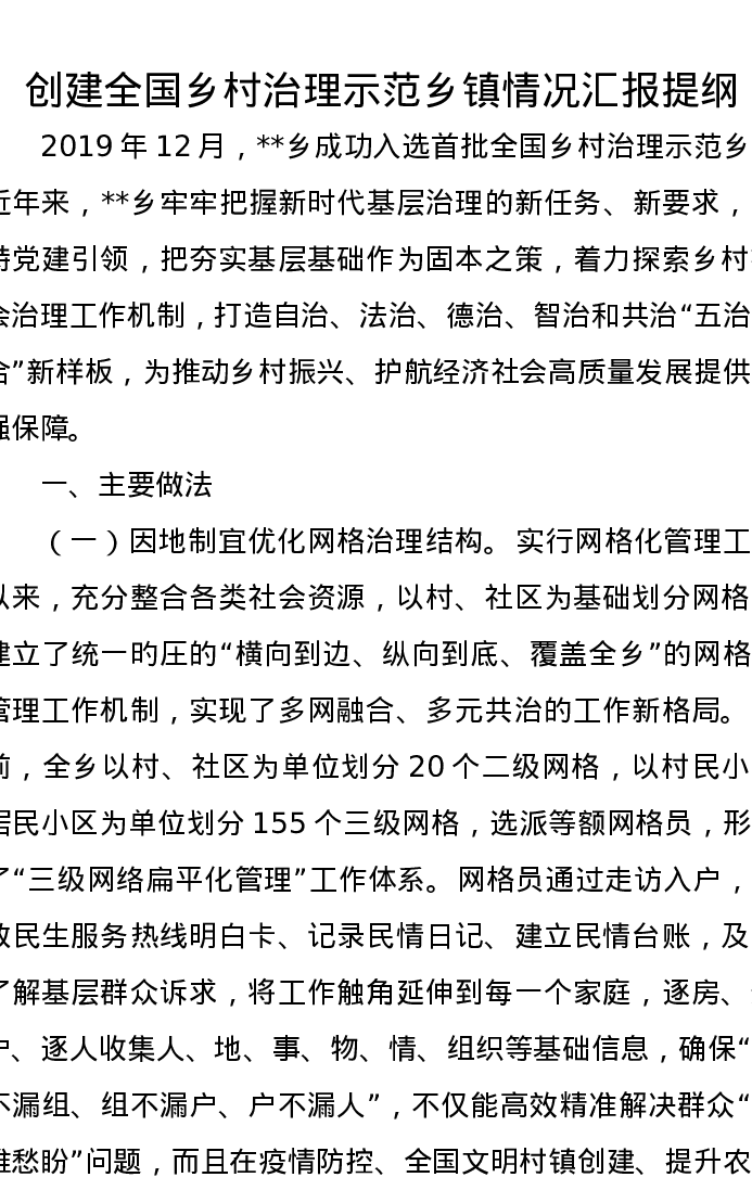 创建全国乡村治理示范乡镇情况汇报提纲