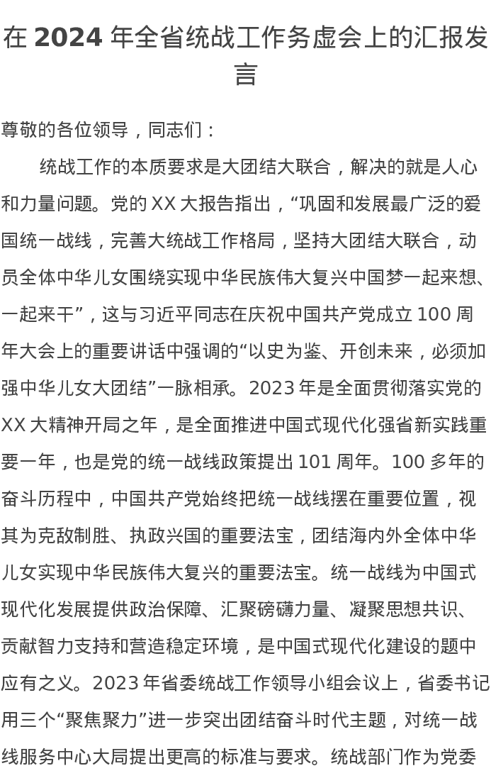 在2024年全省统战工作务虚会上的汇报发言