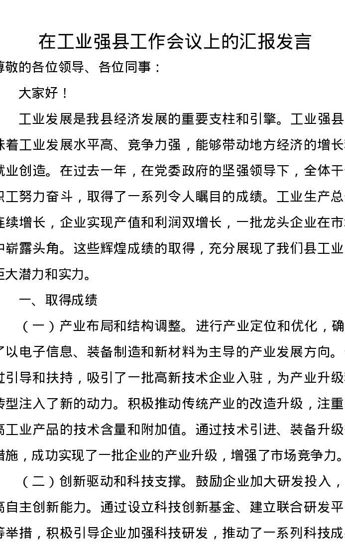 在工业强县工作会议上的汇报发言
