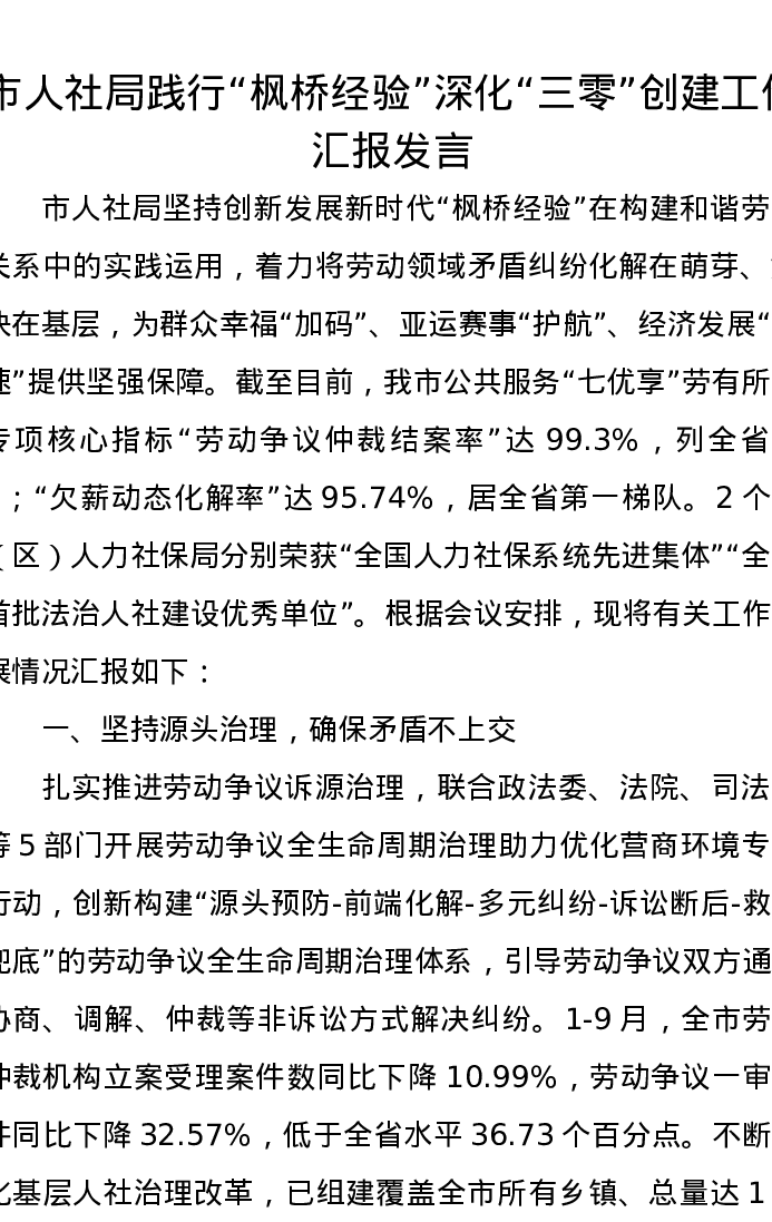 市人社局践行“枫桥经验”深化“三零”创建工作汇报发言