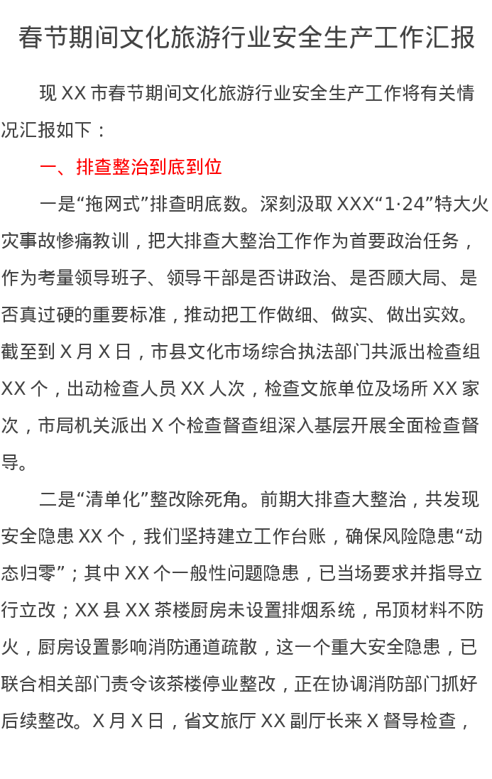 春节期间文化旅游行业安全生产工作汇报