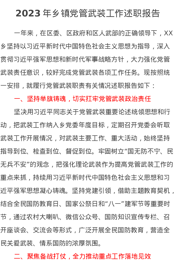 2023年乡镇党管武装工作述职报告