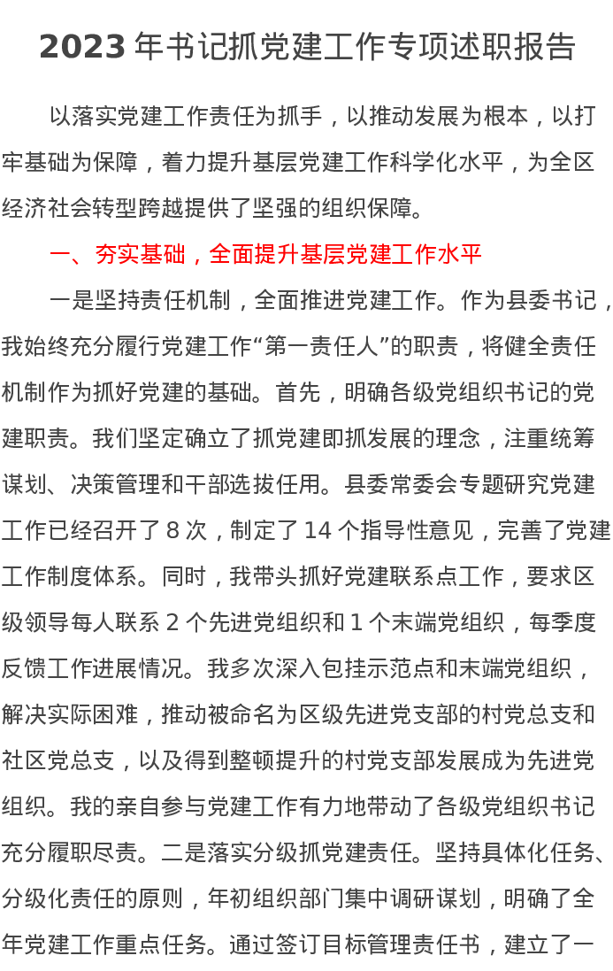 2023年书记抓党建工作专项述职报告