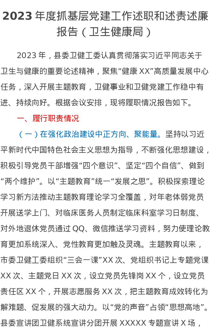 2023年度抓基层党建工作述职和述责述廉报告(卫生健康局)