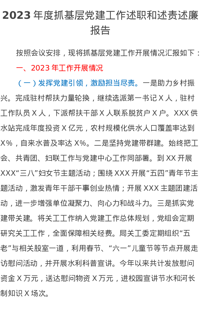 2023年度抓基层党建工作述职和述责述廉报告(水利局)