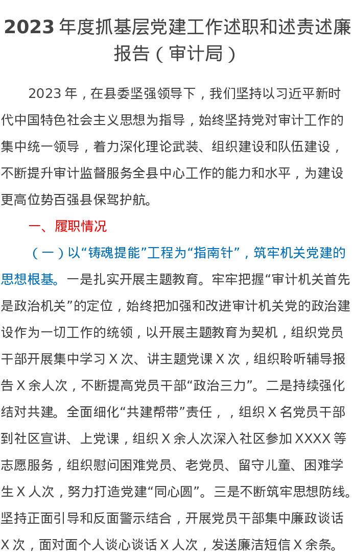 2023年度抓基层党建工作述职和述责述廉报告(审计局)