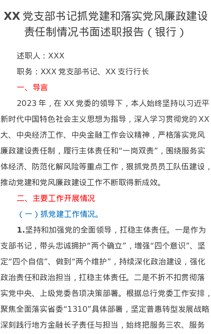 XX党支部书记抓党建和落实党风廉政建设责任制情况书面述职报告(银行)