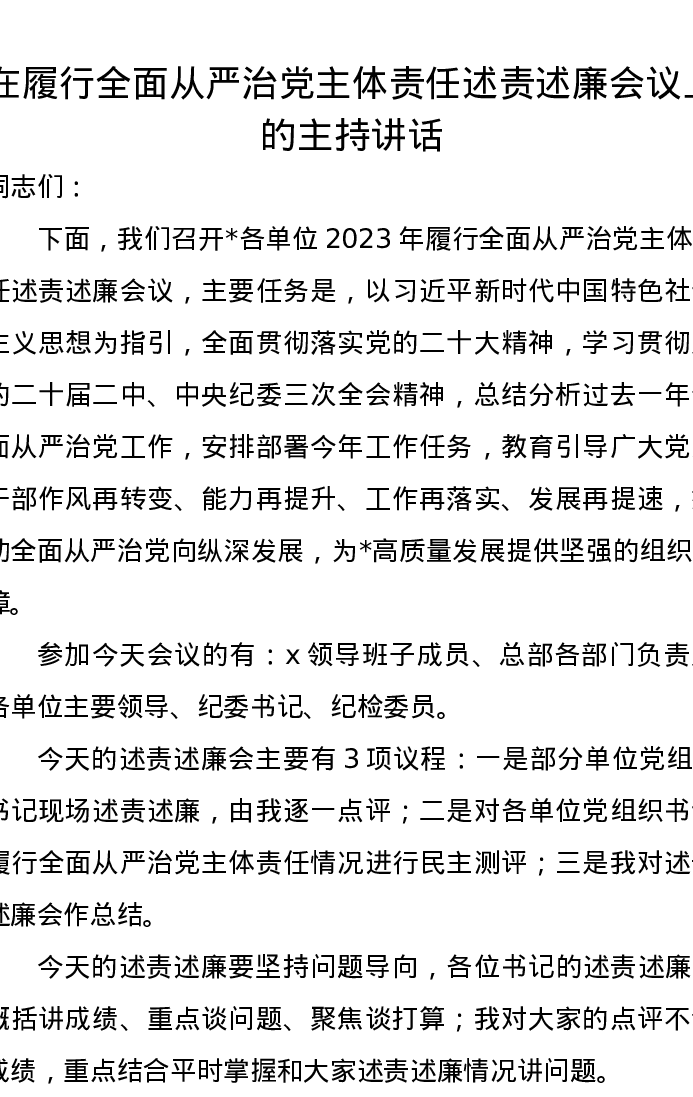 在履行全面从严治党主体责任述责述廉会议上的主持讲话