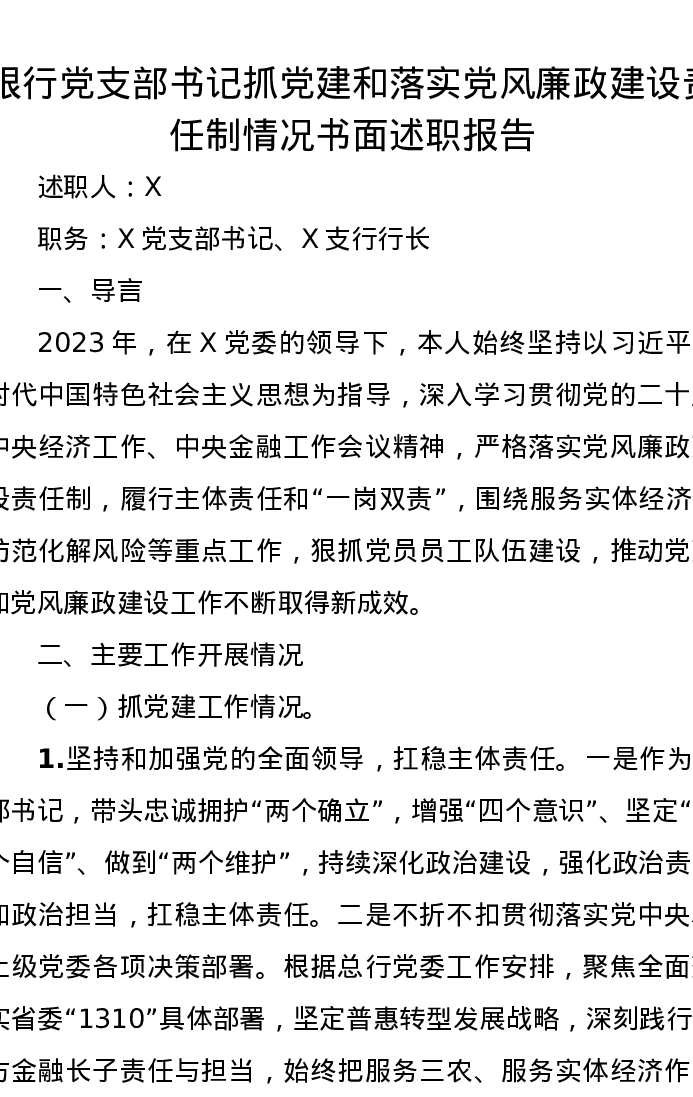 银行党支部书记抓党建和落实党风廉政建设责任制情况书面述职报告