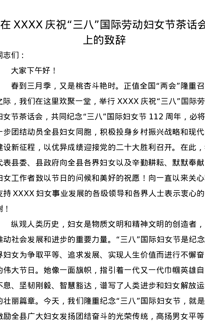 在XXXX庆祝“三八”国际劳动妇女节茶话会上的致辞