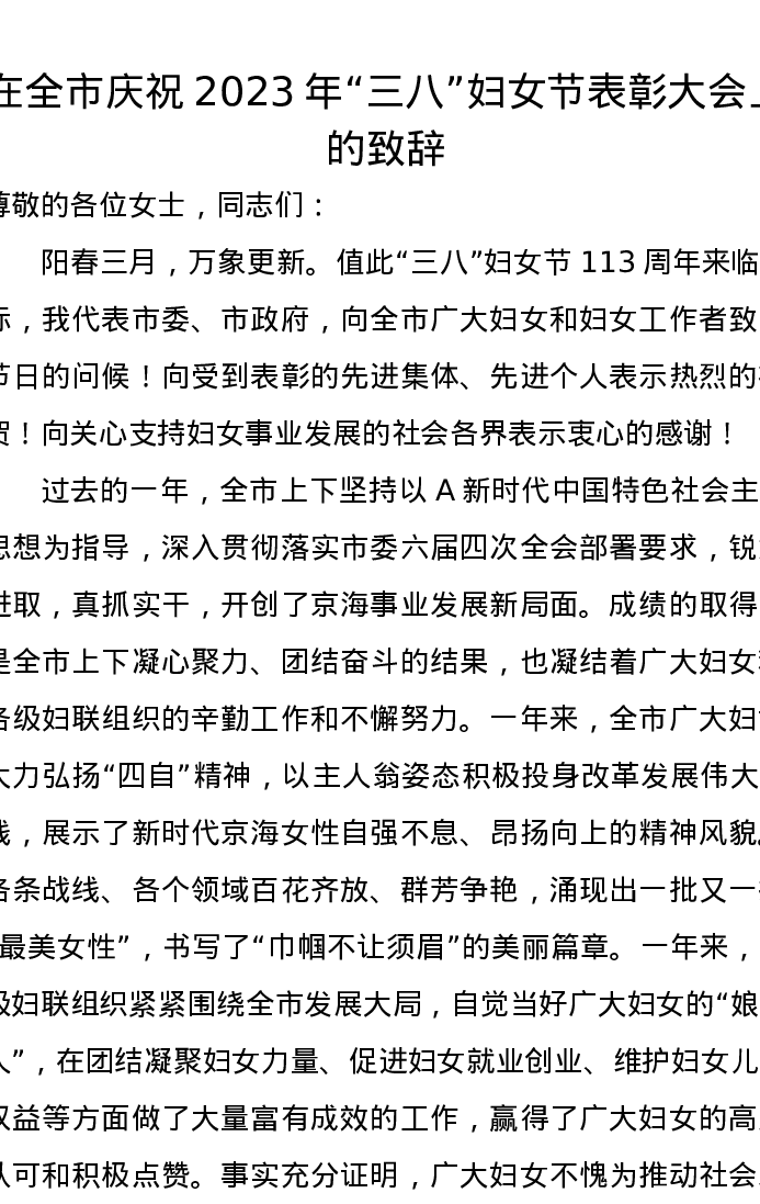 在全市庆祝2023年“三八”妇女节表彰大会上的致辞