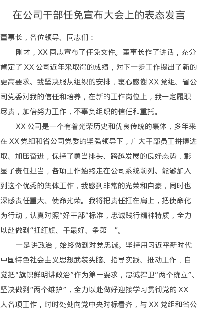 在公司干部任免宣布大会上的表态发言