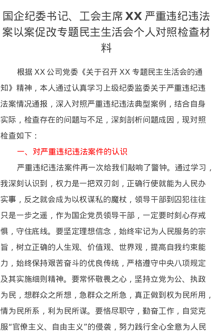 国企纪委书记、工会主席XX严重违纪违法案以案促改专题民主生活会个人对照检查材料