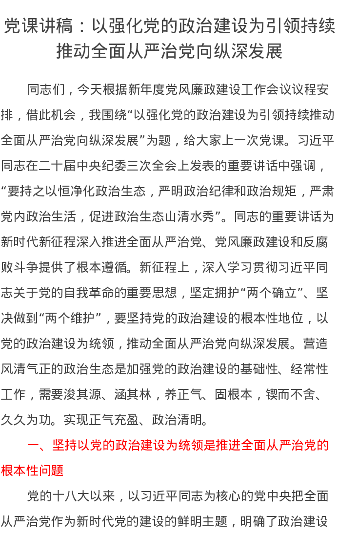 党课讲稿:以强化党的政治建设为引领持续推动全面从严治党向纵深发展