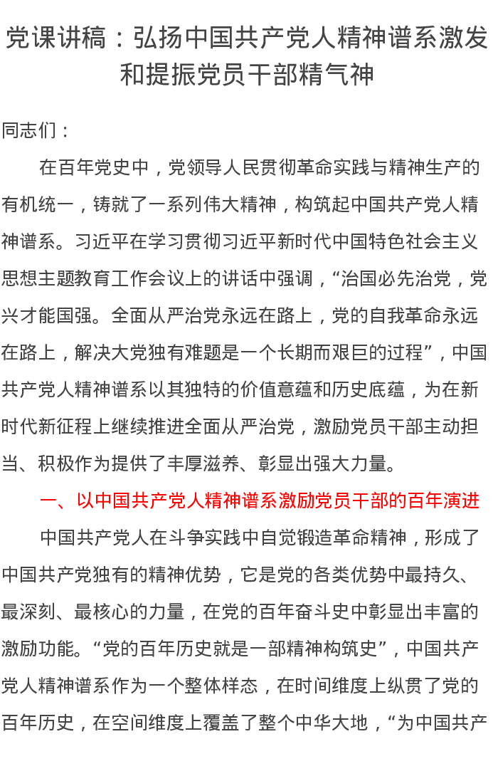 党课讲稿:弘扬中国共产党人精神谱系激发和提振党员干部精气神