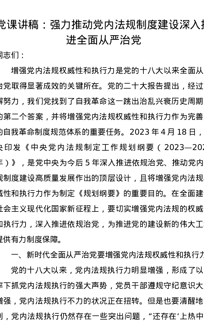 党课讲稿:强力推动党内法规制度建设深入推进全面从严治党