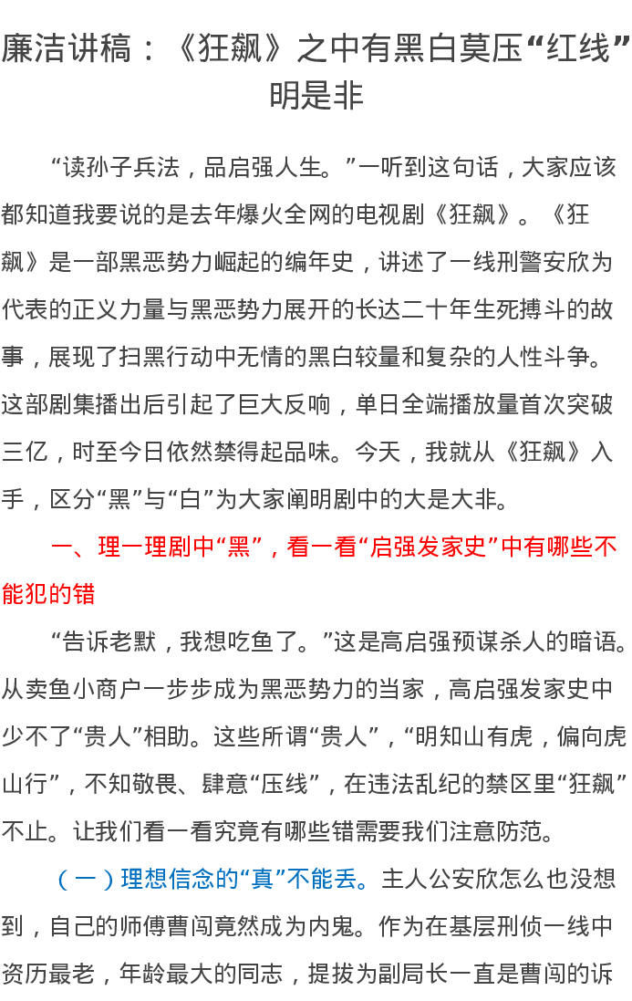 廉洁讲稿:《狂飙》之中有黑白莫压“红线”明是非