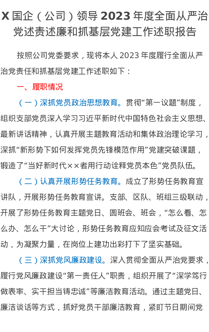 X国企(公司)领导2023年度全面从严治党述责述廉和抓基层党建工作述职报告