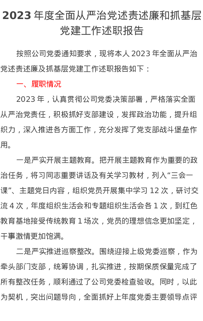X国企(公司)领导2023年度全面从严治党述责述廉和抓基层党建工作述职报告5